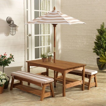 The KidKraft Outdoor Patio Set is ideal for enjoying a picnic, playing games or simply visiting on beautiful days. The adjustable umbrella offers shady relief from the summer sun and the padded benches are perfectly kid-sized. Constructed from weather-resistant wood with a beautiful stained finish, this set will look good for years to come.